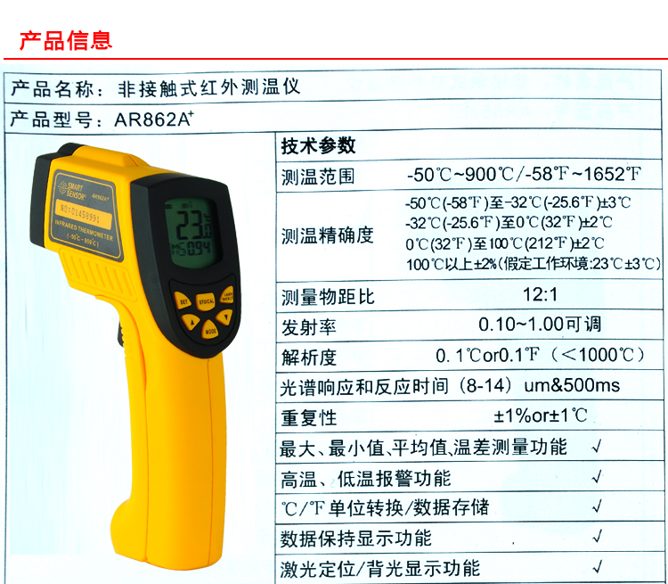 產(chǎn)品型號(hào):紅外線測溫儀AR862A+