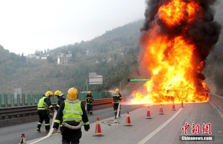 11月12日,京昆高速四川廣元段一輛載有30噸危險化學(xué)品掛車突然起火,現(xiàn)場多次發(fā)生爆炸。中新社發(fā)鐘欣攝