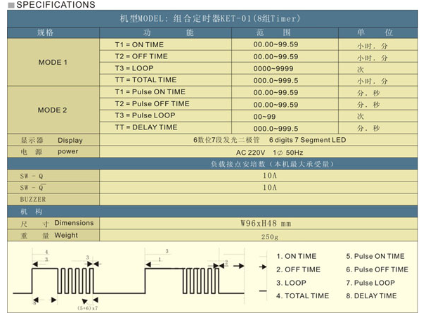 Burn-in(老化)用組合定時(shí)器 特 點(diǎn): (1)可設(shè)定 8 組 TIMER 時(shí)間數(shù)值。 (2)簡易操作的人機(jī)介面。 (3)具 AUTO RESET 功能 (4)具有 10A 負(fù)載能力,加上電磁開關(guān)可推動大負(fù)載。 (5)執(zhí)行終了警示,可外接 BUZZER或燈號顯示。 (6)資料可儲存,OFF 後資料不消失。