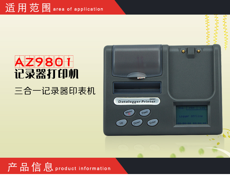 溫濕度記錄儀打印機(jī)AZ9801-AZ9802產(chǎn)品簡(jiǎn)介: **的構(gòu)思:****臺(tái)三合一記錄器印表機(jī) 輕巧隨身攜帶,不需連接電腦可隨時(shí)設(shè)定打印 可設(shè)定啟動(dòng)開始和停止時(shí)間及下載數(shù)據(jù)打印. 可外接電源變壓器,長(zhǎng)久使用 不操作5分鐘自動(dòng)關(guān)機(jī)。 輸速率可選的在4800個(gè)比特/秒與9600個(gè)比特/秒