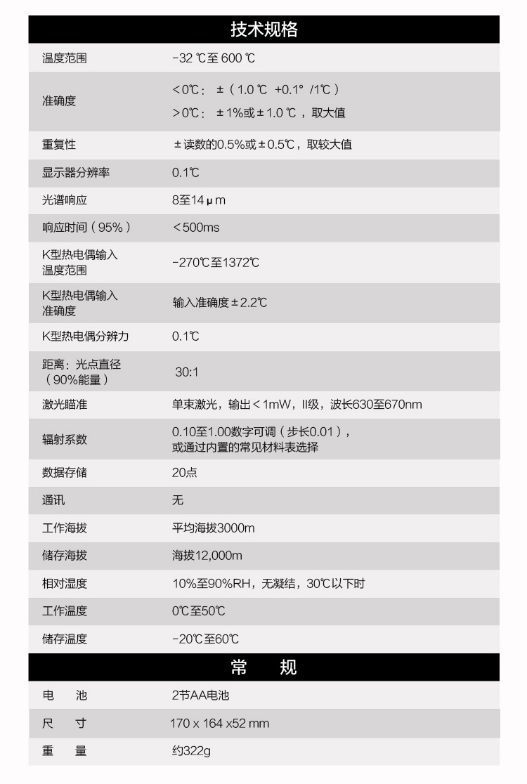 ● 可調(diào)輻射系數(shù)功能(內(nèi)置材料表),讓用戶放心測量多種表面