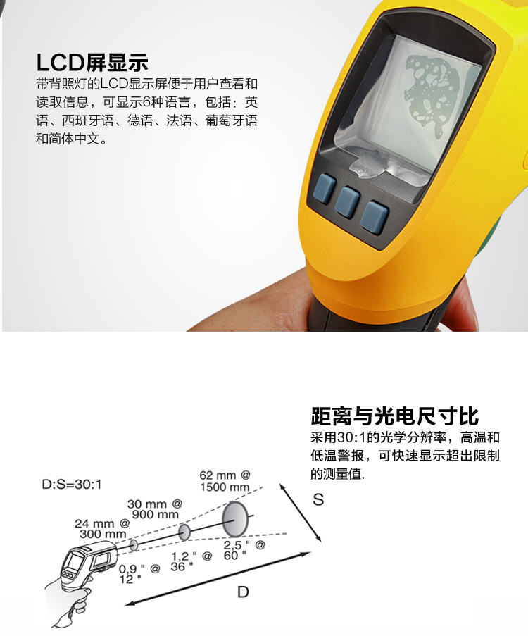 Fluke 562和563的特性和優(yōu)點(diǎn) 測量范圍:-32°C至760°C/-25°F至1400°F(Fluke 563)或-32°C至600°C/-25°F至 1100°F(Fluke 562)● 可測量距離更遠(yuǎn)、體積更小的對象,D:S比率達(dá)50:1(Fluke 563) 或30:1(Fluke 562)