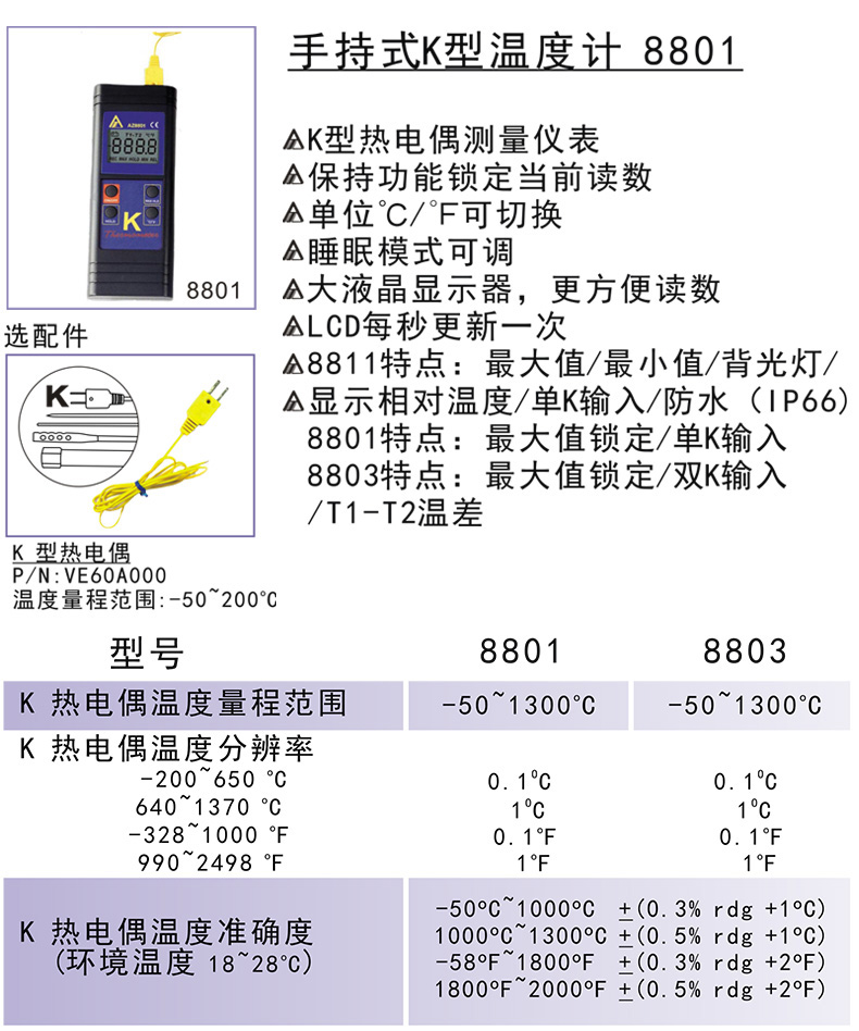 K型熱電偶溫度計(jì)AZ8801產(chǎn)品簡(jiǎn)介: ◆單組輸入T1,K型熱電偶◆℃/℉切換功能! ◆溫度范圍為-50℃~1300℃! ◆自動(dòng)關(guān)機(jī)!