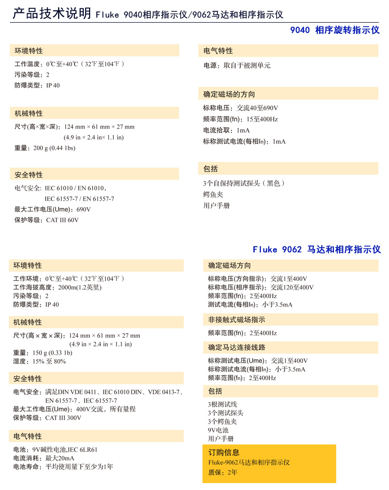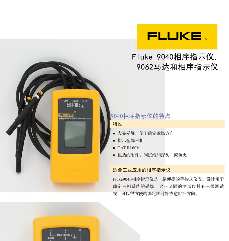 相序旋轉(zhuǎn)指示儀,滿足工業(yè)應(yīng)用的高電壓能力 在所有采用三相電源為馬達(dá)、驅(qū)動(dòng)和電氣系統(tǒng)提供電能的領(lǐng)域,F(xiàn)luke 9040均可以有效地測(cè)量相序旋轉(zhuǎn)方向。Fluke 9040是一款旋轉(zhuǎn)磁場(chǎng)指示儀,可通過(guò)LCD顯示屏清晰指示3個(gè)相線以及相序旋轉(zhuǎn)方向,以確定正確的連接。利用它可以快速確定相序,其電壓(高達(dá)700 V)和頻率范圍非常適合于商業(yè)和工業(yè)應(yīng)用。附帶的測(cè)試探頭具有可變的鉗夾范圍,可**進(jìn)行連接,并且是工業(yè)插孔。