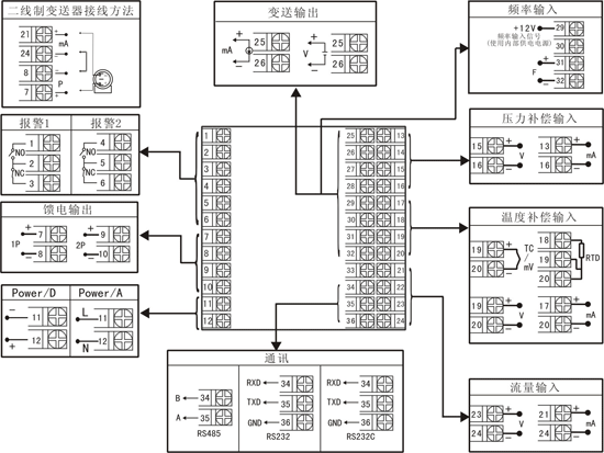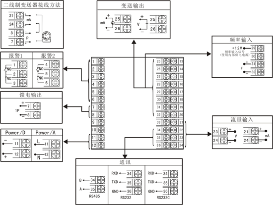 注1:接線圖中在同一組端子標(biāo)有不同功能的,只能選擇其中一種功能。 如RS485和RS232在同一組接線端子上,只能選擇一種。
