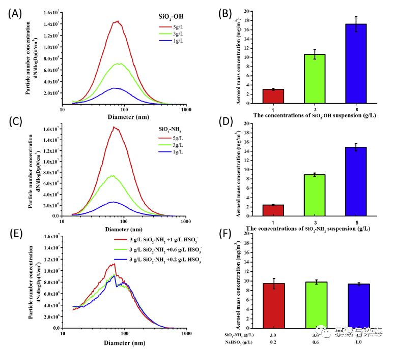 The exposure doses of NM aerosols. The size distributionsof aerosols of (A) SiO2-OH, (C) SiO2-NH2 and (E) SiO2-NH2@HSO3 in the 14.6e661.2 nm particle size range. The mass concentrations ofaerosol particles of (B) SiO2-OH, (D) SiO2-NH2 and (F) SiO2-NH2@HSO3 in the 14.6e661.2 nm particle size range after exposure on BEAS-2Bcells for 3 h at ALI.