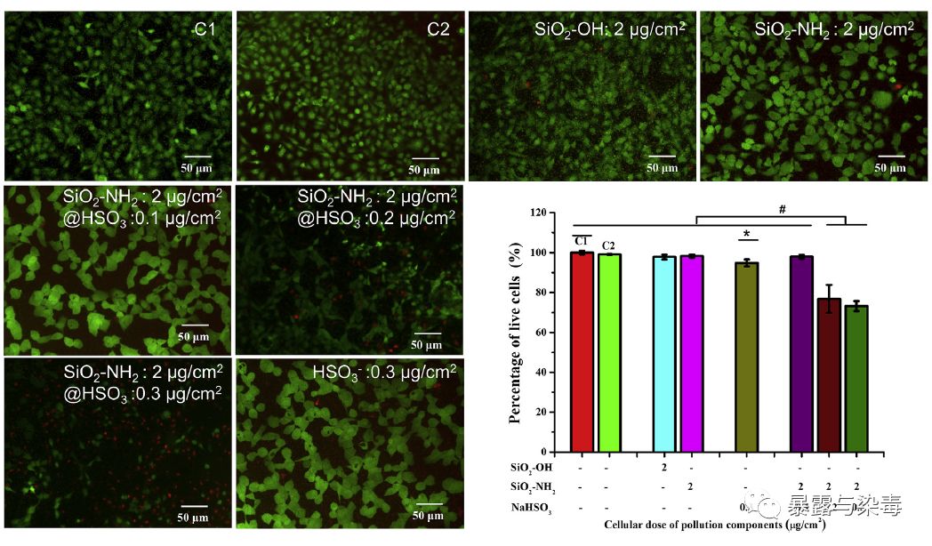 The live & dead testing results of BEAS-2B cells after exposureto aerosols for 3 h at ALI and extra incubation in ALI chamber for 5 h. Thedata represent the mean of at least three independent experiments normalized tocontrols of ALI. C1 is the ALI exposure control of filtered clean air; C2 is the normal cell controlcultured in incubator. *P <0.05, #P < 0.01 vs the indicated groups.