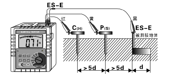 5.三線測(cè)試接地電阻 三線測(cè)試:如下圖,短接儀表的 ES、E 接口,即為三線測(cè)試,儀表操作與四線測(cè)試相同。三線 測(cè)試不能消除線阻對(duì)測(cè)量的影響,也不能消除儀表與測(cè)試線間、測(cè)試線與輔助接地棒間接觸電阻變 化對(duì)測(cè)量的影響,測(cè)量時(shí)還需去除被測(cè)接地體表面的氧化層。