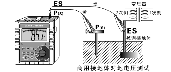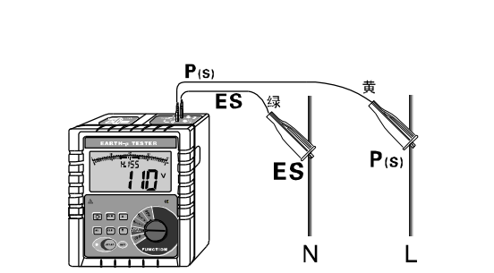 3.交流電壓測(cè)試 交流線路電壓測(cè)試不能操過(guò) 600V。 連接 P(S)、ES 接口測(cè)試商用交流電壓,無(wú)需連接 C(H)、E 接口。 交流電壓測(cè)試,指一般的商用交流電壓測(cè)試,注意區(qū)別接地電壓,本儀表可以用于測(cè)試 600V 以下的交流線路電壓。 參見(jiàn)下圖:先將測(cè)試線與儀表的 P(S)、ES 接口連接,再將測(cè)試線接入被測(cè)線路,都連接好后, 將 FUNCTION 功能轉(zhuǎn)換旋鈕切換至“EARTH VOLTAGE”位置開(kāi)始測(cè)試,LCD 顯示測(cè)試結(jié)果。